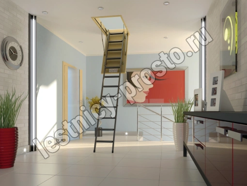 Чердачная металлическая лестница LMS – это надежная складная конструкция, состоящая из марша и термоизоляционной крышки, изготовленной из ДВП и окрашенной в бежевый цвет. Герметичность всей конструкции достигается благодаря утеплению крышки люка и контурному уплотнению по периметру, что предотвращает возможные теплопотери. Чердачную лестницу очень легко разложить и сложить благодаря наличию специального стержня с четырехугольной насадкой.
