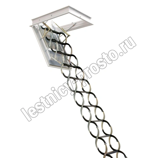 Сертифицированная, противопожарная лестница, огнестойкость: EI1 20 / EI2 60 / EW 60. Лестница чердачная, раздвижная, ножничного типа, работает по принципу сжатия. Крышка лестницы представляет собой многослойную конструкцию – деревянная рама, внутри которой находится теплоизоляция и противопожарная вставка. Внутренняя часть крышки покрыта оцинкованной жестью, наружная часть белой эмалью и защитной пленкой. Толщина крышки 60мм. Лестница предназначена для установки в утепленное чердачное помещение, где колебание температуры не превышает 10 градусов. Все соединяющие части изготовлены из твердого материала и имеют оцинкованное покрытие. Короб металлический высотой 140мм. по периметру проходит уплотнитель.