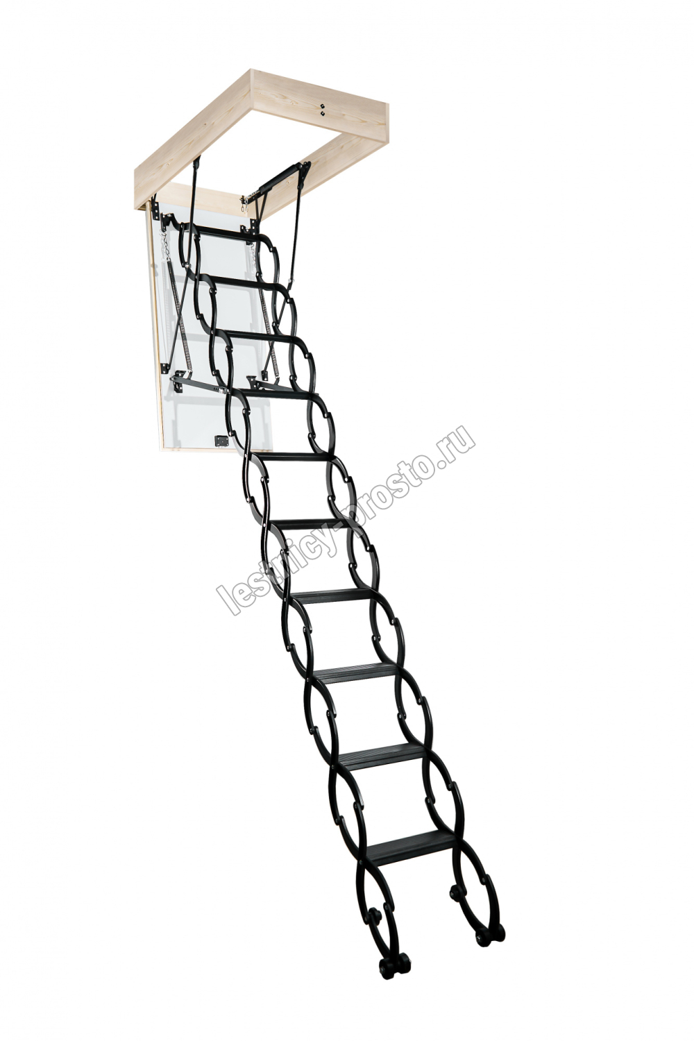 Материалы: корпус и утепленный люк из древесины хвойных пород с теплоизоляцией из пенопласта; ступени и тетивы из металла для максимальной прочности.