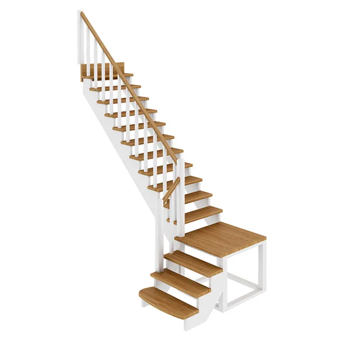Ступени и поручень лестницы выполнены из дуба, остальные элементы из сосны. Возможно изготовление данной модели полностью из дуба. Базовый комплект включает в себя деревянные элементы лестницы и ограждения без какого-либо покрытия.