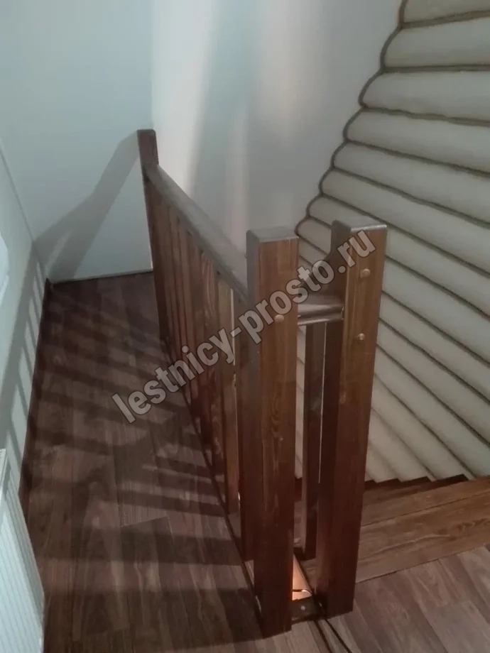 Обратите внимание! Данный вариант лестницы изготовлен из сосны эконом-класса, имеющей заметные серые/синие вкрапления цвета - это не отражается на прочности лестницы, но может быть заметно при покраске в светлые тона.