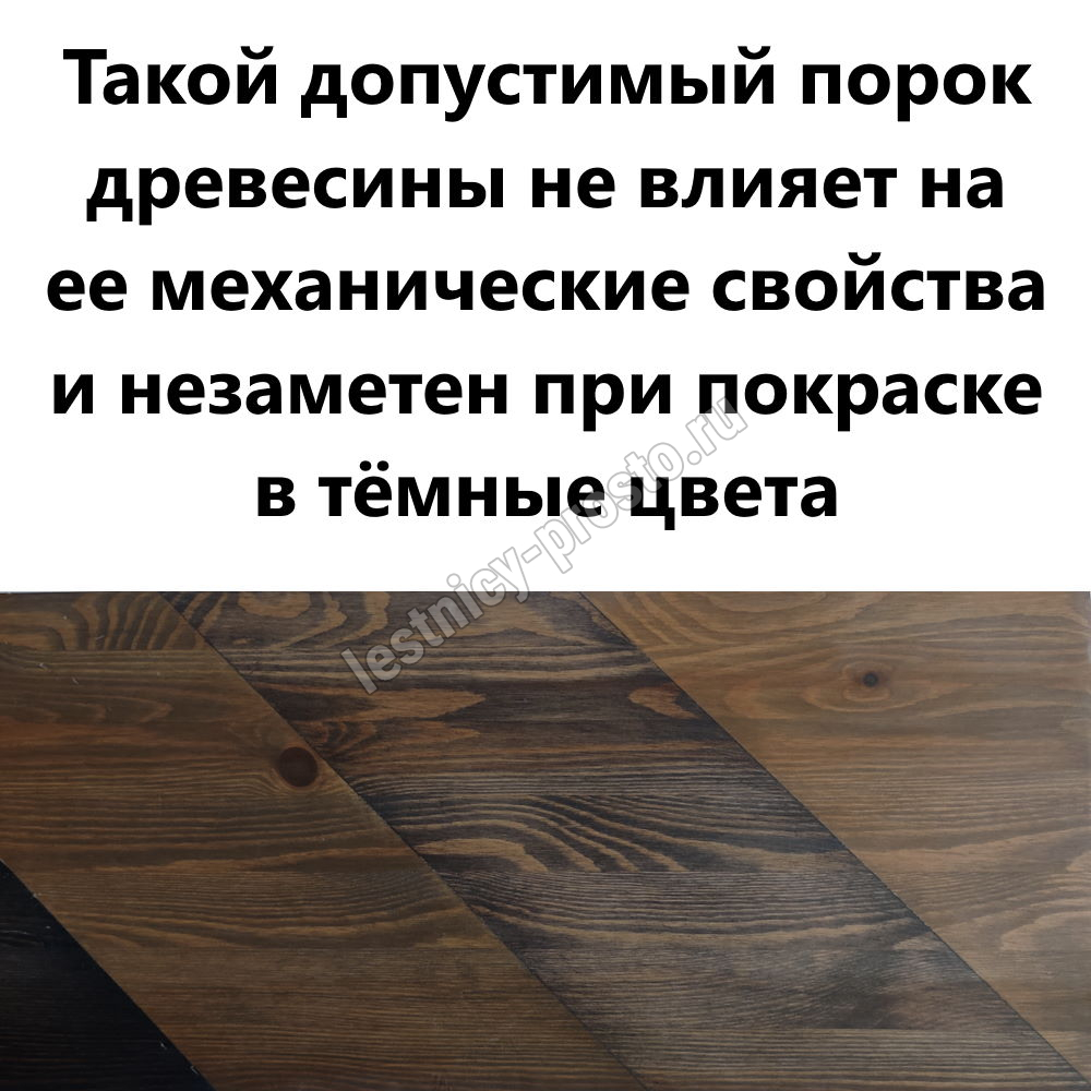 Обратите внимание! Данный вариант лестницы выполнен из сосны эконом-класса - это выражается заметными областями синевы на древесине, данная особенность никак не влияет на прочность и надежность лестницы, но может быть заметной при прозрачном покрытии или покраске лестницы в светлые тона.