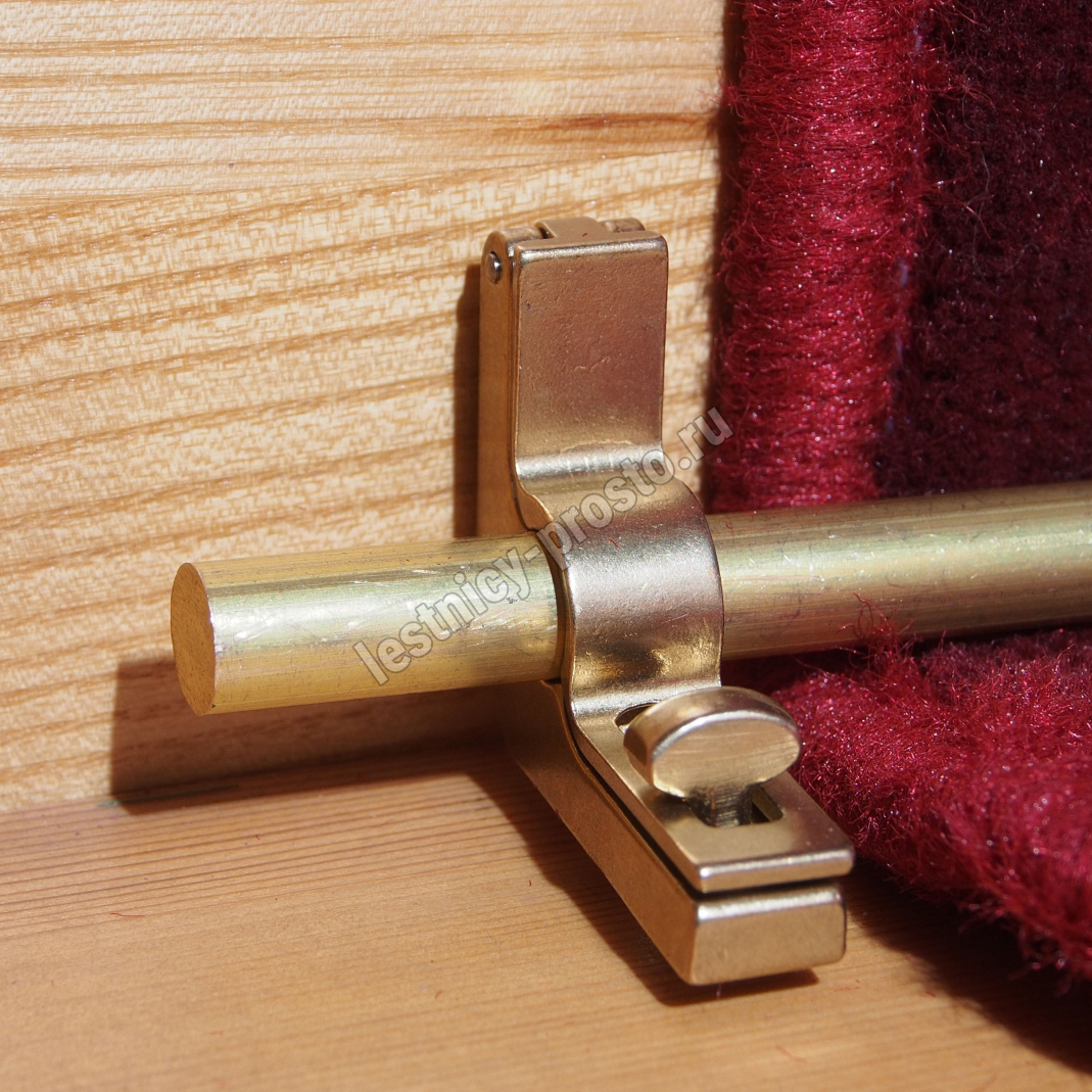 Ковродержатель комплектуется двумя держателями из латуни цвета золото, а также цельным прутком из латуни длиной от 101 до 130 см. Конструкция является сборно-разборной не требующей демонтажа креплений, что делает ее долговечной и очень удобной для чистки ковров и ковровых покрытий.