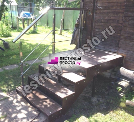 Ступени лестницы состоят из металлической рамки, обеспечивающей необходимую прочность, и покрытия из террасной доски ДПК (древесно-полимерный композит). Ступени не боятся воды и мороза, не теряют со временем свой внешний вид и не требуют ухода.