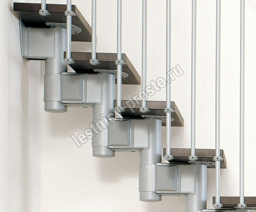 При монтаже этой лестницы, возможно регулировать высоту и глубину шага, таким образом можно получить лестницу под высоты этажа в диапазоне 2250 - 3030 мм, кроме того, установив дополнительный комплект увеличения высоты, можно поднять высоту лестницы до 3730 мм. Ширина проступи регулируется при монтаже в пределах 180 - 220 мм. Каркас и стойки ограждения выполнены из пластифицированного металла. Уникальный модульный каркас позволяет собрать лестницу необходимой формы.