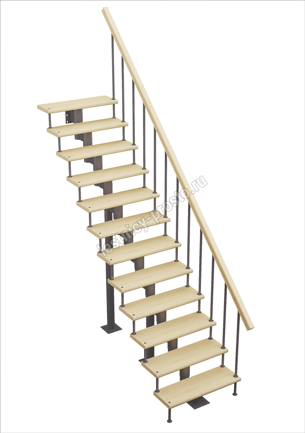 Каркас лестницы представляет собой набор модулей, которые комплектуются уже готовыми к монтажу.