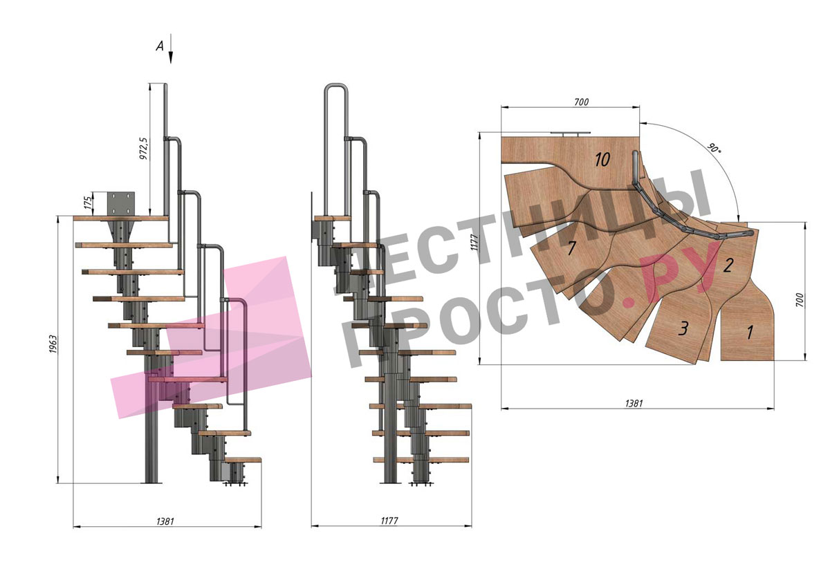 Лестница Prosto Urban Black гусиный шаг 700 мм, h180-264 см (10 ступеней), ясень