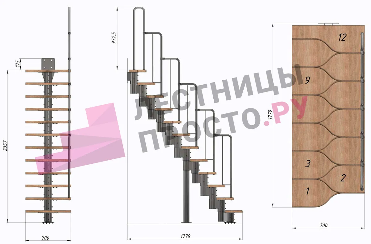 Лестница Prosto Urban Black гусиный шаг 700 мм, h216-312 см (12 ступеней), бук
