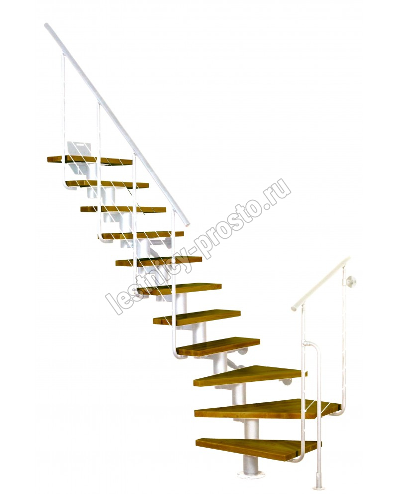 Есть возможность регулировать высоту ступеней. В комплект входят перила с вертикальными стойками и горизонтальными перегородками.
