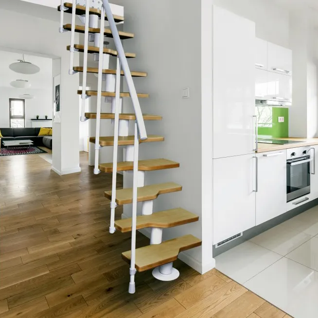 С помощью дополнительных секций(покупаются отдельно) можно увеличить высоту лестницы до 3750 мм. Модульный каркас лестницы позволяет собрать конструкцию, как прямую так и с необходимым небольшим поворотом в нужную сторону, благодаря чему эта модель идеально подходит для помещений с ограниченным пространством, где установка стандартных лестниц невозможна.