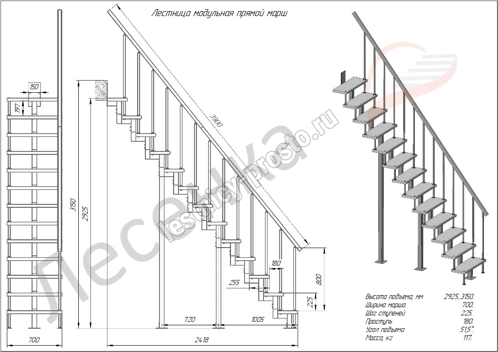 Модульная малогабаритная лестница Линия 2925-3150, Черный, Сосна, Крашеная, Без Ступений