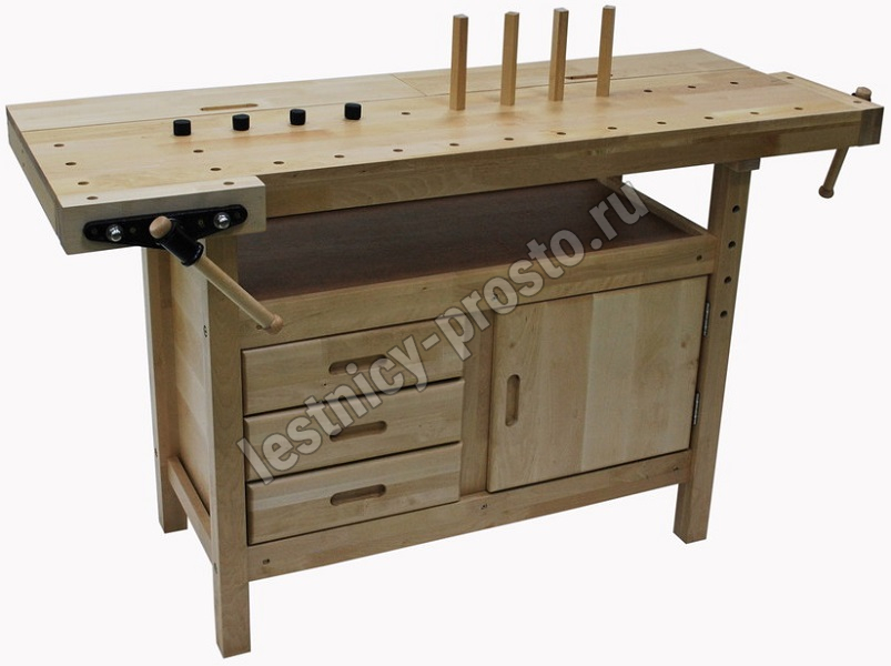 Комплектация: 2 комплекта тисков, 2 пенала в столешнице, 3 ящика, 1 шкафчик, полка