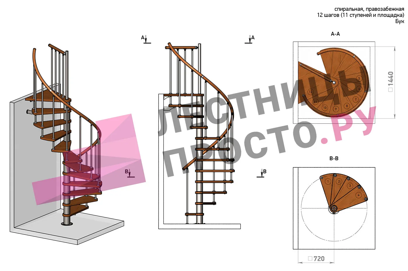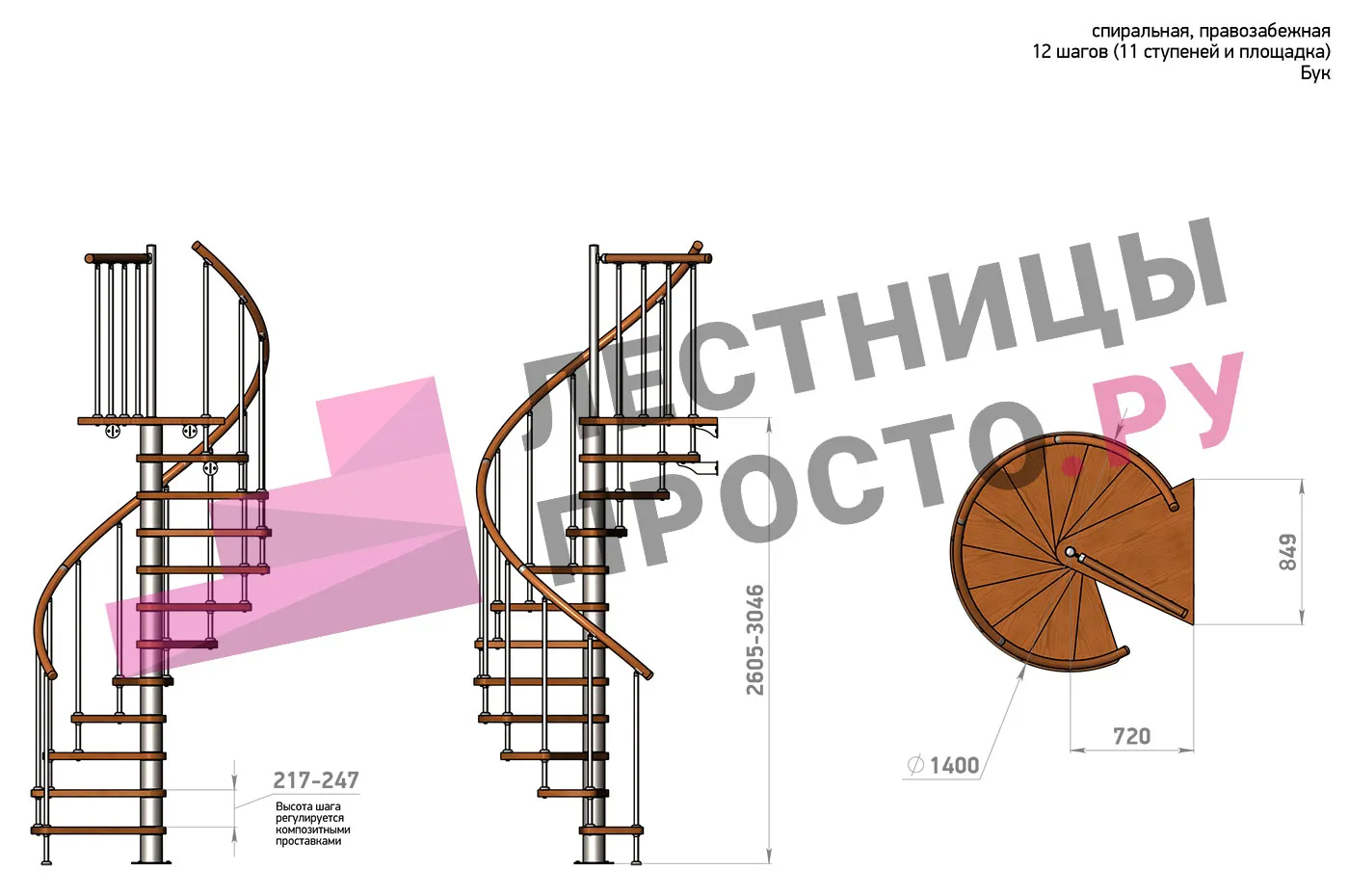 Винтовая лестница Prosto Spiral Black D140см, h260.5-304.6 см, бук