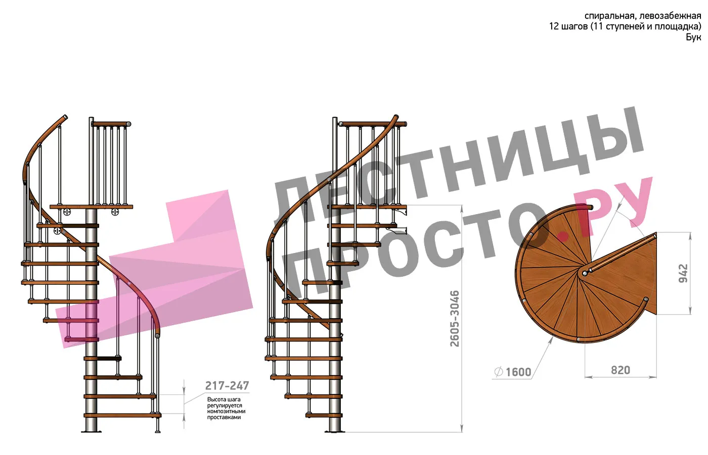 | Винтовая лестница Prosto Spiral White D160см, h260.5-304.6 см, бук |