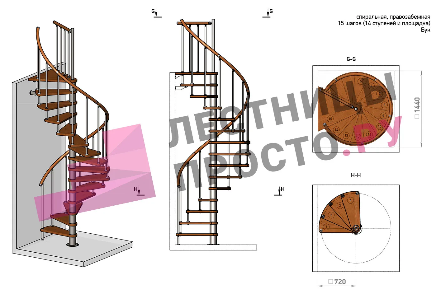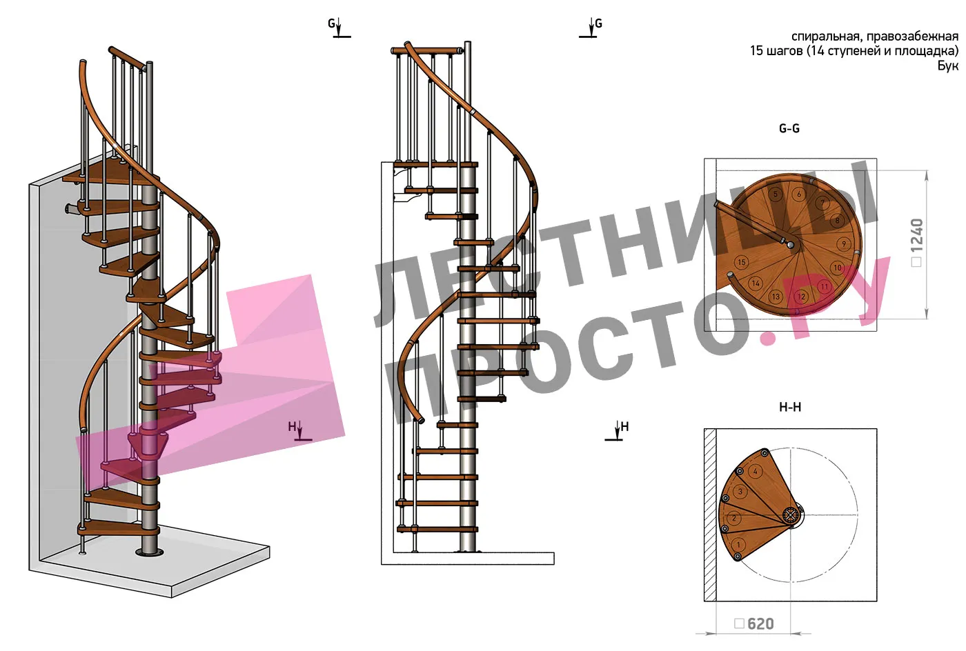| Винтовая лестница Prosto Spiral White D140см, h303.9-348,1 см, бук |