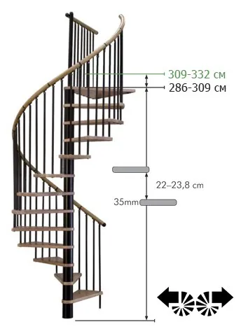 Лестница представлена в двух вариантах: с поворотом направо и с поворотом налево. Благодаря возможности регулировать высоту шага с помощью пластиковых вставок (входят в базовый комплект), высоту лестницы можно варьировать в пределах от 2860 до 3090 мм. Кроме того, купив дополнительную секцию для этой лестницы, можно поднять высоту до 3320 мм. Поручень изготовлен из массива дуба в тон ступеням. Ступени и поручень покрыты износостойким защитным лаком.