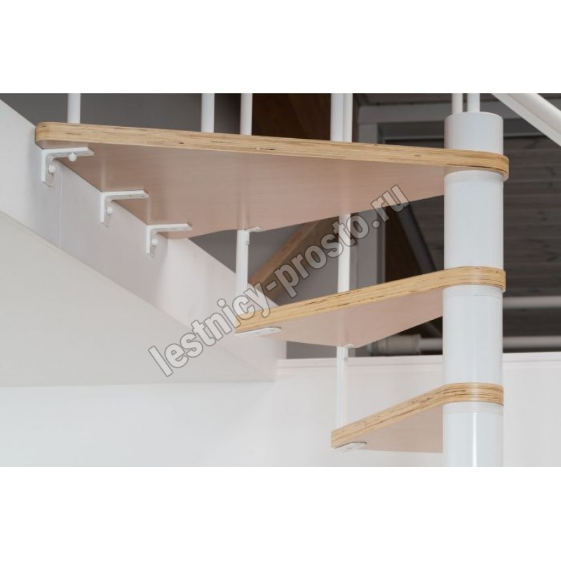 Ступени лестницы изготовлены из бука по технологии MULTIPLEX и покрыты износостойким защитным лаком. Лестница монтируется как по часовой стрелке, так и против. Возможен монтаж в круглый или квадратный проём. Ограждение: стальные трубки, Ø25 мм RAL 9016. Поручень: гибкий цельный ПВХ-поручень Ø40 мм белого цвета. Конструкция и балюстрада окрашены порошковым способом в белый цвет (RAL 9016).