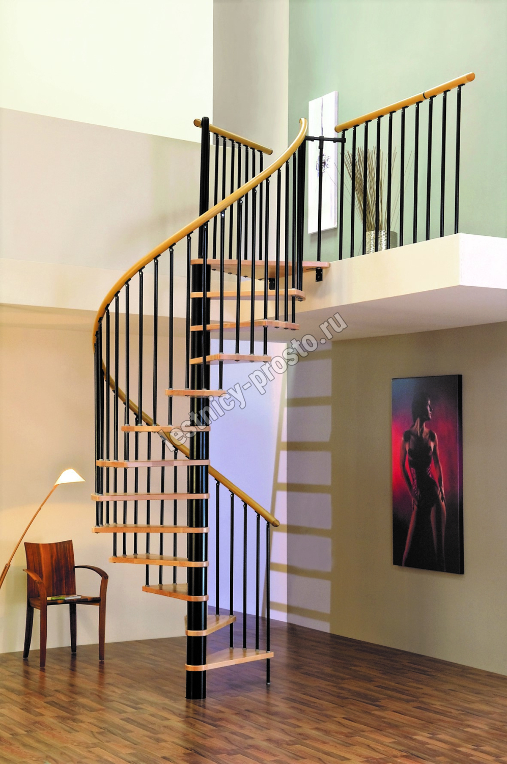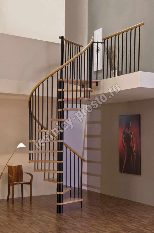 Поручень лестницы изготовлен из массива дуба в тон ступеням. Ступени и поручень покрыты износостойким защитным лаком.